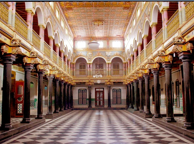 Karaikudi is the biggest city in Chettinad,a region best known to the outside world for its distinctive cuisine. What is less well known is that this small area, comprising about 72 villages, was the setting for a fascinating period of Modern Tamil history. The Chettiar community of traders,part of this region since the Pallava Dynasty ruled here between the 4th and 9th centuries AD,amassed huge wealth which was transferred back to villages in Chettinad where their increasing social status and power was manifested in sumptuous possessions ranging from diamonds to brass to pewter and,most visibly,in their grand mansions.Now,just the empty but impressive mansions remain,with one or two old members rattling around, keeping house with memories, photographs and bats for company.